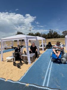 Our participants took in the scene as they moved across the sand using beach matting, rested under cabanas with daybeds, and explored the shoreline with the support of beach wheelchairs and walkers. These features may seem simple, but the impact was powerful, they removed barriers and replaced them with confidence, independence and choice.